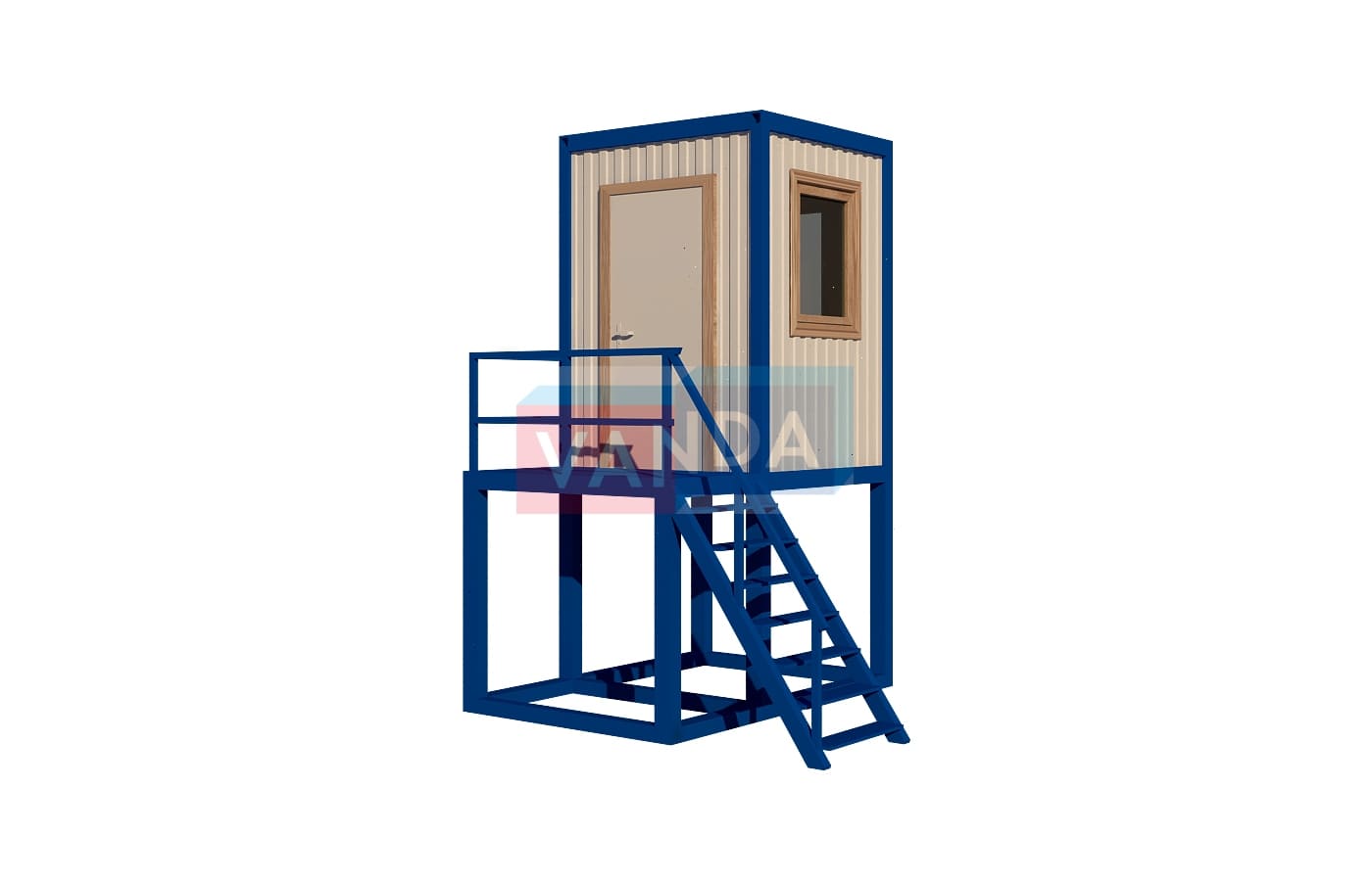 Пост охраны на подиуме №1 (вариант 2) изготавливается из несущего каркаса (верхняя и нижняя обвязка): швеллер 100х50х3 мм., угловые стойки: сложно - гнутый угол 90х90х3 мм., крыша блок-контейнера: металл сварной 0,9-1 мм., качественная наружная отделка: оцинкованный профлист, вспомогательный деревянный каркас (стены) выполнен из брусок 40х75 мм., лаги пола: обрезная доска 40х100 мм., лаги потолка: обрезная доска 40х100 мм., выполнено утепление: Минеральная вата «ISOVER» – 50 мм. и пароизоляция: плёнка техническая, черновой пол состоит из: обрезная доска 20 мм. (2 сорт), чистовой пол покрыт: ДСП строительное 16 мм., отделка пола выполнена из качественных материалов. Контейнер комплектуется окнами: деревянное, двойное остекление 800х1000, входной дверью: ДГ 21-8 обшита снаружи оцинкованным листом, врезной замок и внутренними дверями. Если в БК присутствуют перегородки, то для них используется: брусок 40х50 мм. Лестница постамента имеет перила, тетива лестницы выполнена из профтрубы 30х60 мм., ступени из уголка 25х25х3 мм., просечной лист, перила из профтрубы 20х40 мм., площадка перед входной дверью имеет ограждение.
